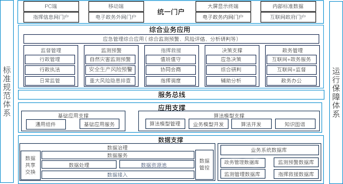 构筑应急管理信息化发展‘四横四纵’ 总体架构,形成‘两网络’、‘四体系’ 、‘两机制’。